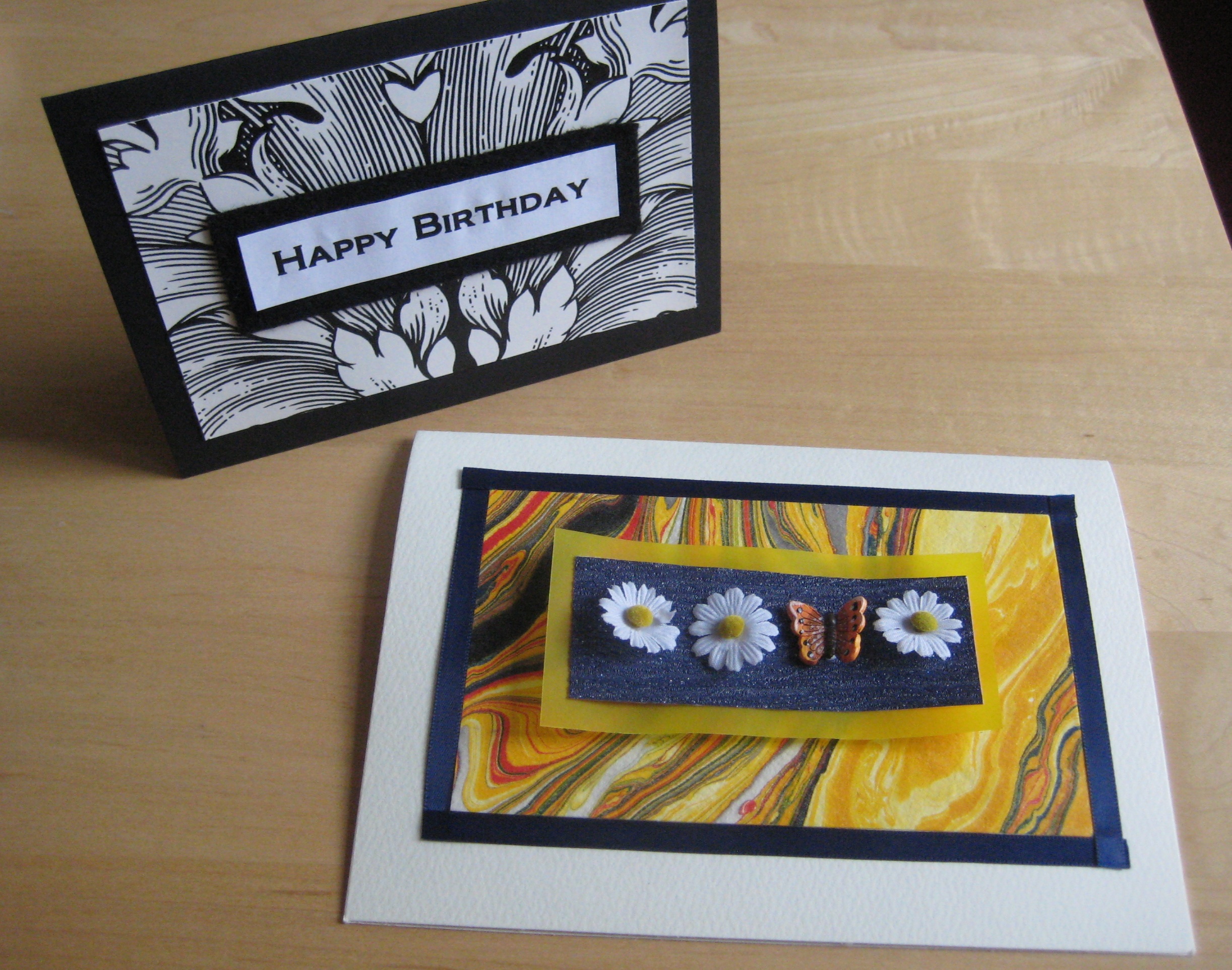 One is for my brother-in-law (I always struggle with cards for men) and the other for my great aunt (who will be 95)! The wallpaper bit for her one is actually the dark blue section under the flowers. But it gave me a great way of using up this a-bit-too-bright marbled paper which has sat in my draw of papers for a few years now without being used.