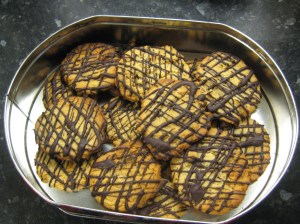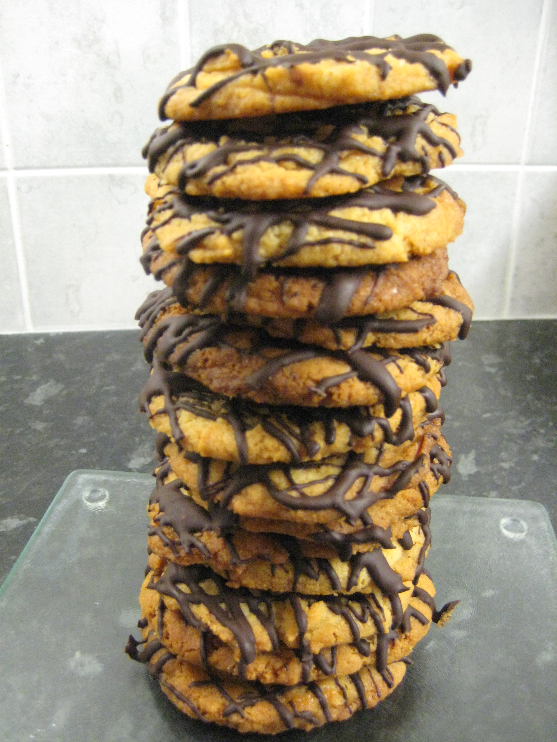 I melted the chocolate in a bowl over another bowl of boiling water and went off to do the vacuuming whilst everything baked/melted. Once the biscuits cooled down enough I just drizzled over the chocolate and left to cool. Job done!