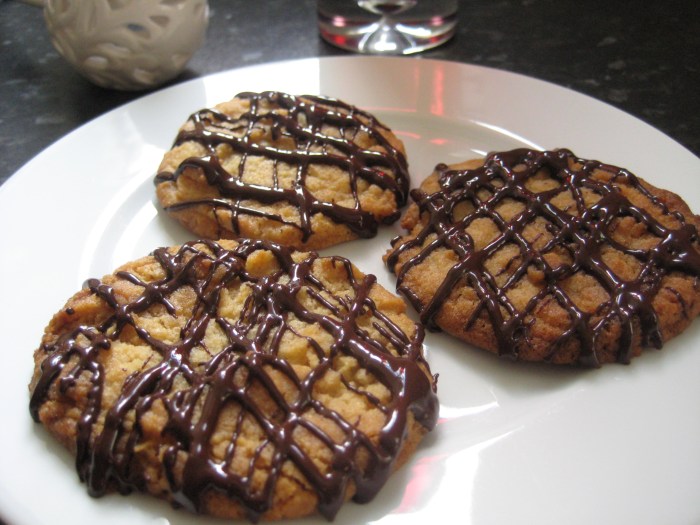 All you do is melt the butter and syrup (I do it in the microwave) and then stir all the ingredients apart from the chocolate together. Spoon the mixture onto a couple of baking trays (leaving room for the biscuits to spread) and pop in the oven for 12 minutes. They come out golden and kind of soft looking but leave them to cool on the tray and they will firm up.