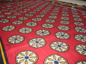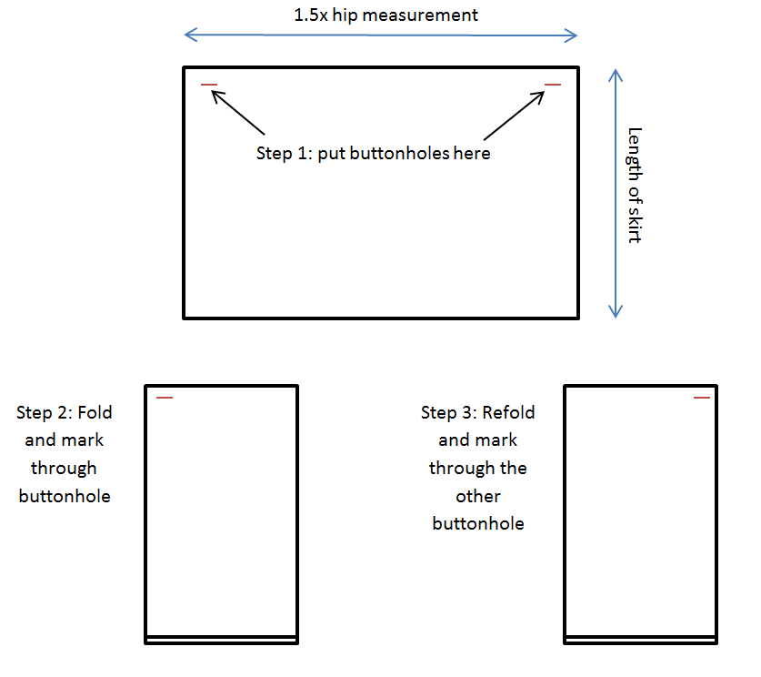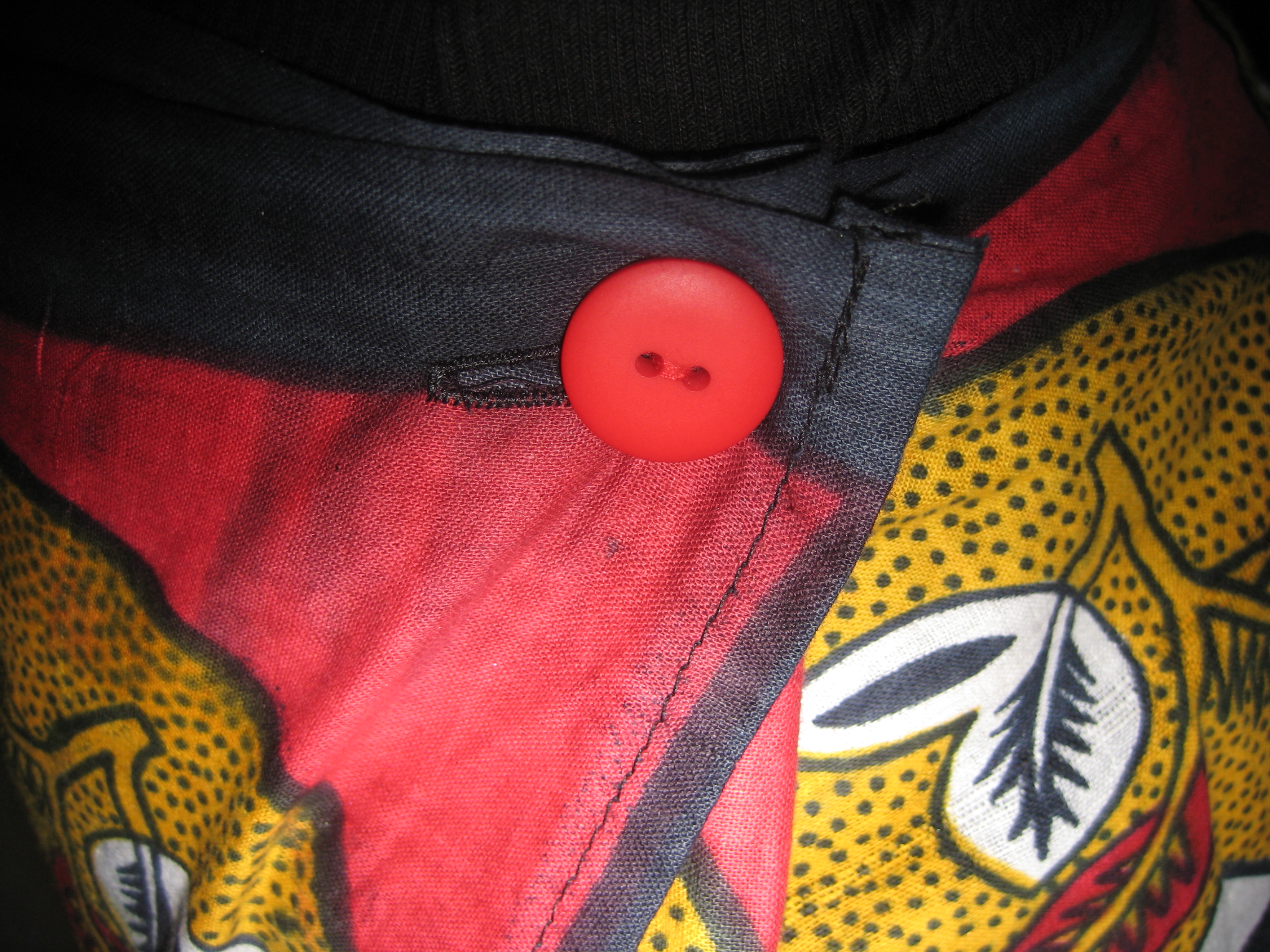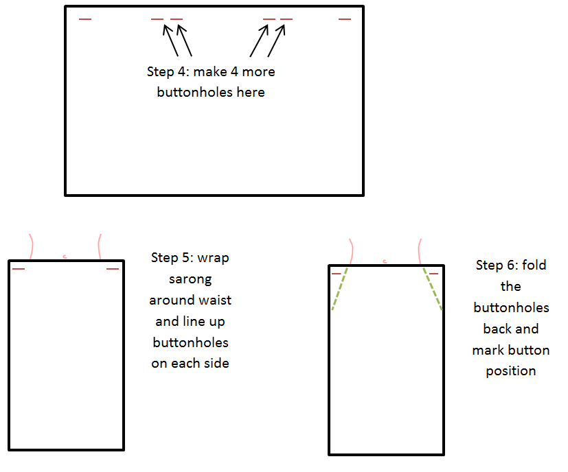 To wear just wrap the sarong around and put each button through the 3 buttonholes on each side. I have put some diagrams below to help you make your own. Pictures of the actual sarong weren’t too clear due to the red/black colour combo!