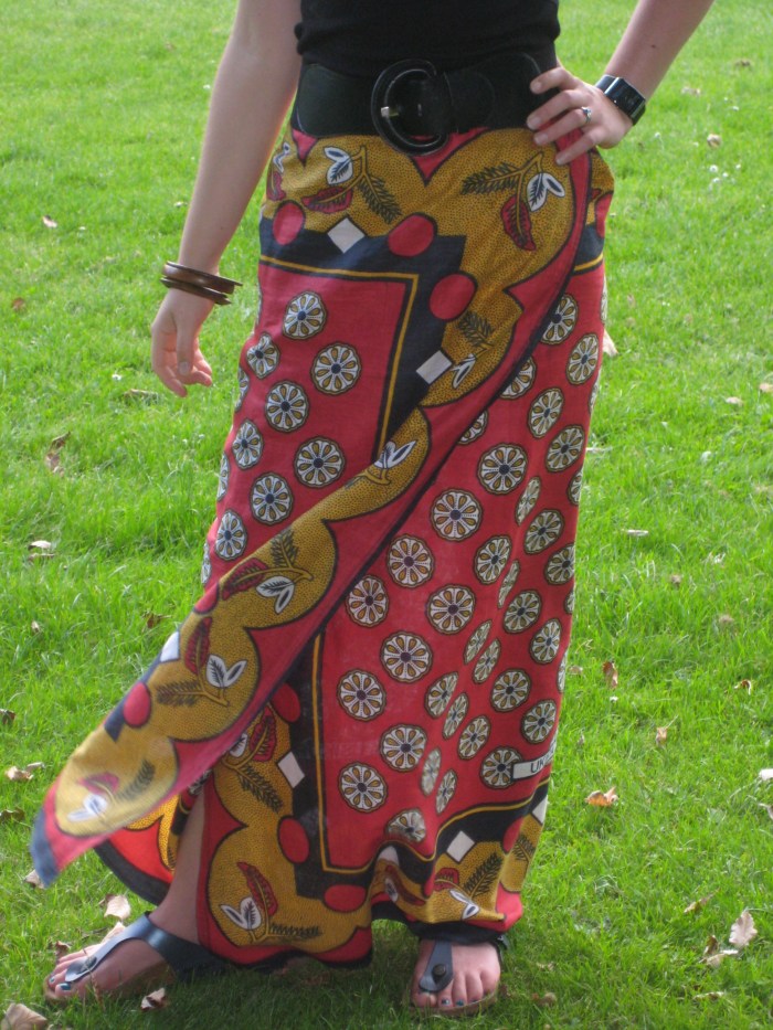 The sarong measures just over 1.5 times my hip measurement and was floor length when held up to my waist, so I didn’t need to shorten it at all. If you want to make your own version any rectangle hemmed all the way round to the right size to fit you will do.
