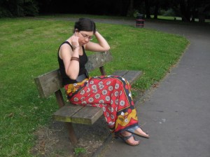 I bought this sarong while on holiday and I really love the colours and geometric print. It’s actually pomegranates with a border around. I wanted to wear it more but living in rainy Manchester there isn’t much opportunity for wearing beachwear! I thought about cutting it up to make a knee length skirt but didn’t want to lose part of the print. So I have turned it into a maxi skirt by stitching in 6 buttonholes and adding 2 buttons. The cool thing about doing it this way is I can still use it as a wrap or a sarong when I go on holiday!