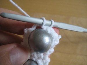 Row 6: sc in first sc, slide up a bead, pull the loop on the hook large enough to fit around the bead and ch1 (see photo), sc in last sc, ch1, turn (3sts)