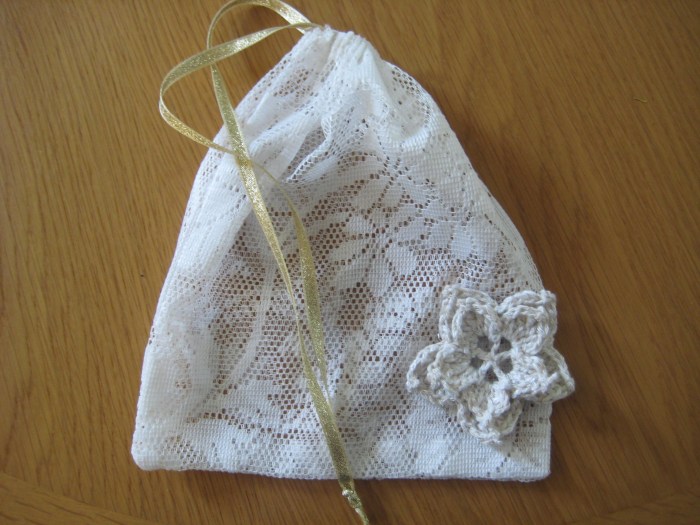 I have also been busy running up some lace drawstring bags from those leftover lace curtains I mentioned in an earlier post, and I plan on using these as gift bags. To make them a bit more interesting I will decorate them with flowers to match whatever is inside, like I have with this scarf.