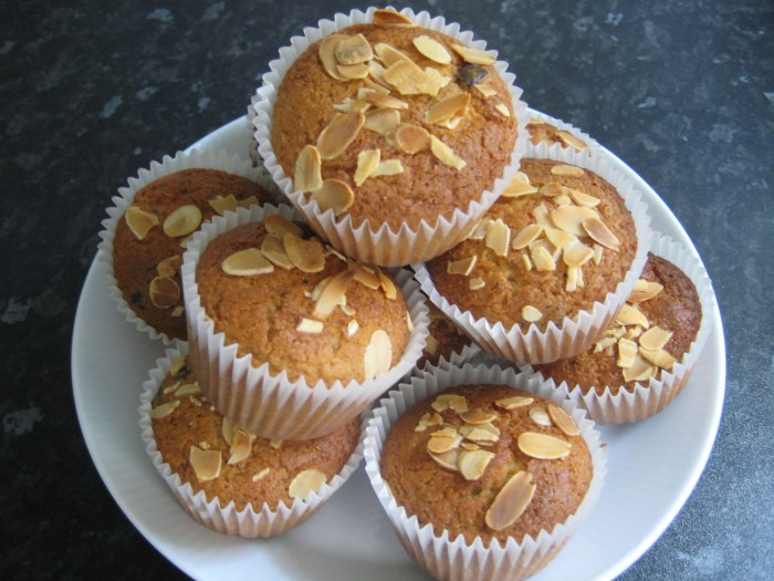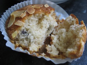 I modified my basic recipe by substituting half a mug of flour (about 90g) for ¾ mug of ground almonds (about 90g). To flavour the muffins I added 1 tsp almond extract and 2 tsp orange extract. I added 60 g dark chocolate cut into chunks but it would have been better with more like 75g, I was just too lazy to open a new packet! Once in the cases I topped off the muffins with a sprinkling of flaked almonds.