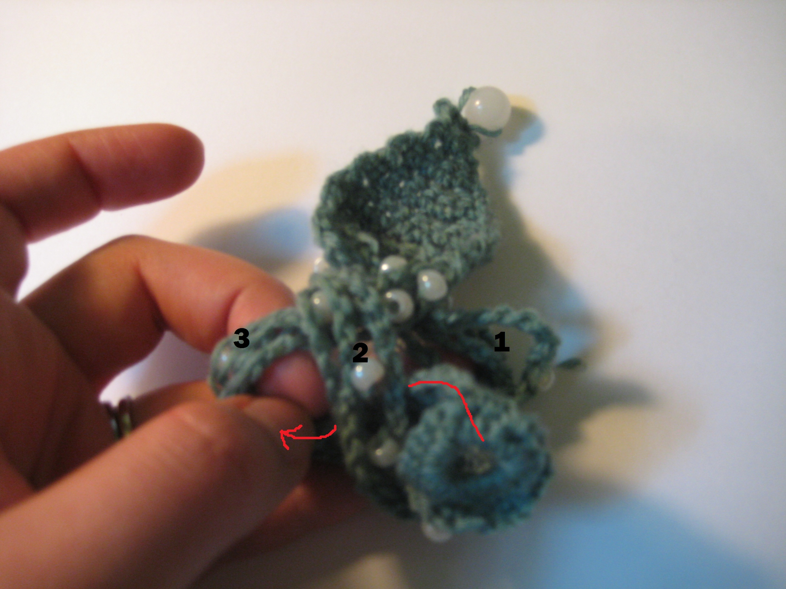 To untwist 1 and 2, flip the end backwards and through the gap between strand 3 and the other two, and pull down to lay the piece flat.