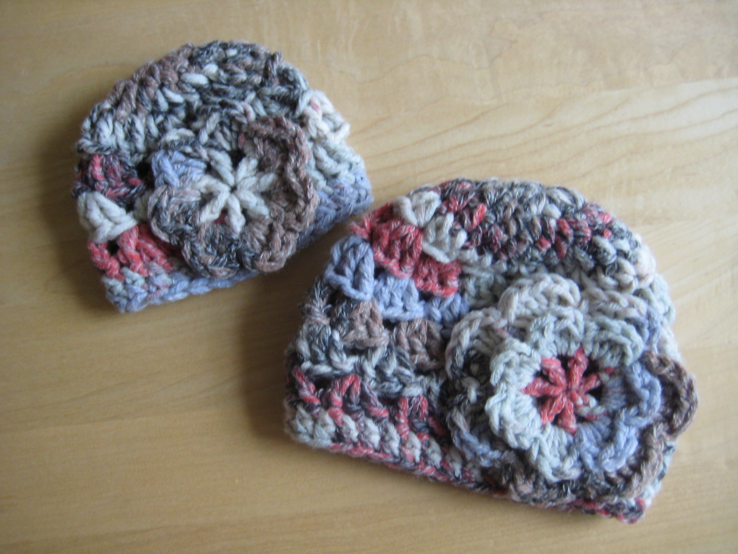 The girl hats are based on a pattern from Ravelry which comes in two sizes and is easy to make bigger or smaller. I got both hats from one ball of wool (Sirdar Crofter Chunky) and used a size 7mm hook (but it was close – I used a smaller hook for the flowers).