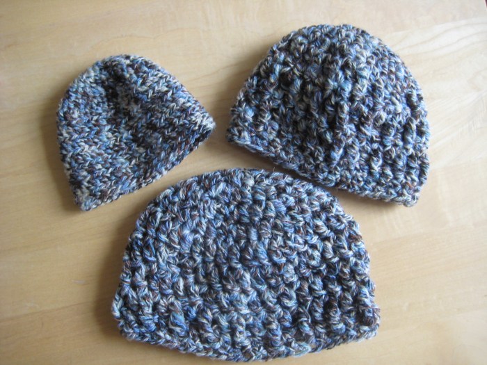 The boy hats are my own patterns which I just made up as I went along. The chunkier ones are two strands used together (I used Sirdar Click in Seashell- I love the colours in this yarn). I make a circle using hdc stitches (similar to the pattern linked to above but starting with 8-12 stitches in the first round, depending on wool thickness and hook size) then switch to dc stitches once the circle is the desired diameter. I made the hats textured by using front post stitches which alternate each round. The newborn size is single stranded and I added interest by crocheting in the back loops only to add ridges once I got to the dc stage.