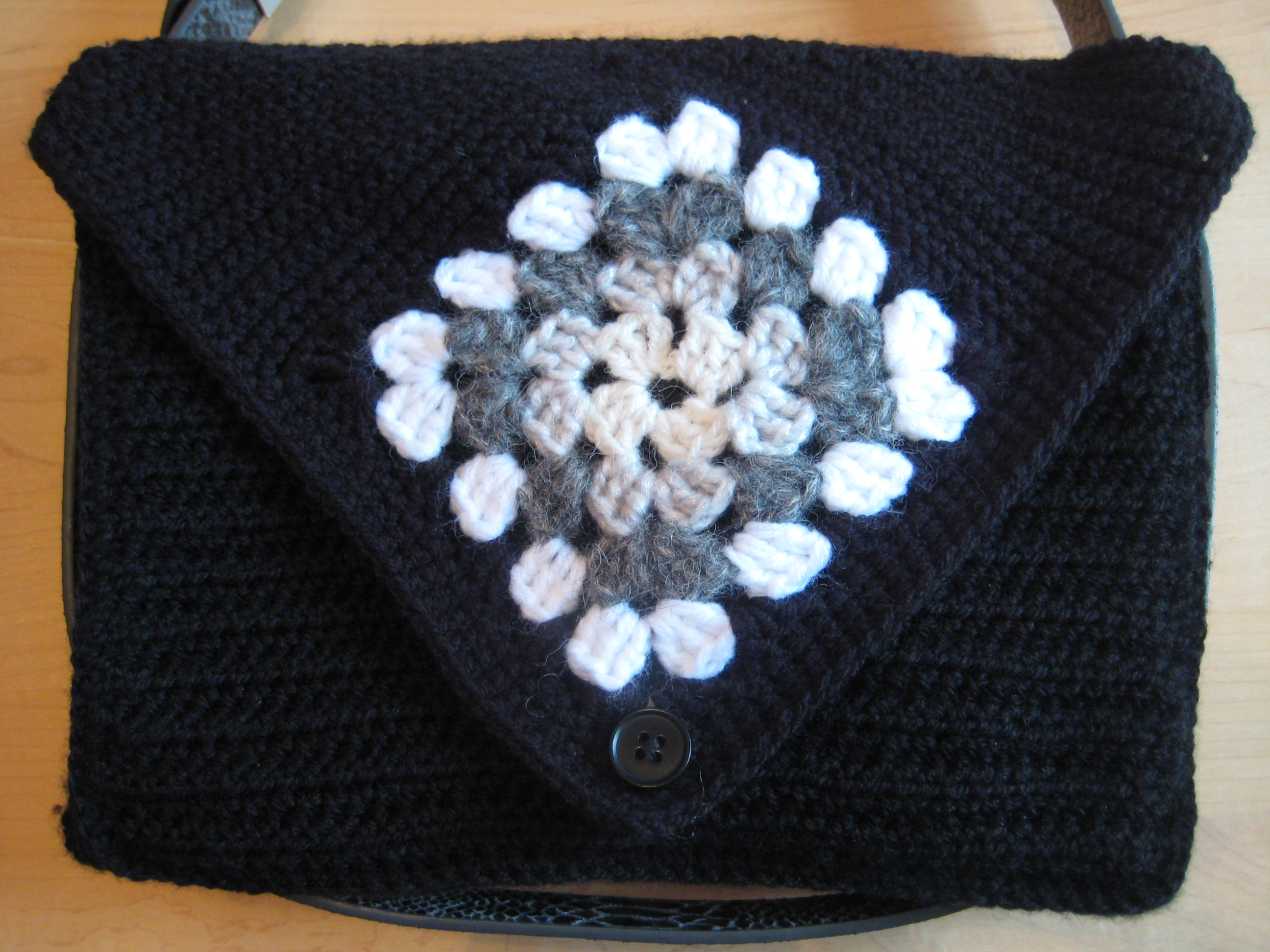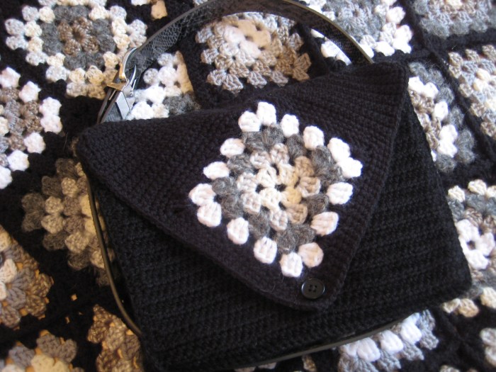 If desired you can add a button (using one of the holes in the granny square as a button hole) to the front to close the flap.