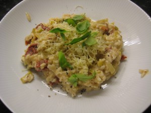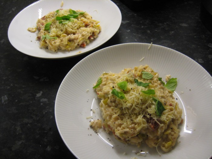 Meanwhile, cut the trimmed leek in half lengthways and cut into slices. Finely chop the garlic. Add to the pan and cook for 2mins. Stir in the rice to coat with oil and cook for 1min. Add the wine or vinegar and stir till absorbed. Then add the hot stock a little a time, stirring until the rice is nearly cooked through (this should take around 8 minutes). Add the tomatoes with the last amount of stock and stir until the rice is cooked (it should be al-dente). Stir in the oregano, soft cheese, and most of the parmesan or cheddar. Season to taste (I like plenty of black pepper with this).