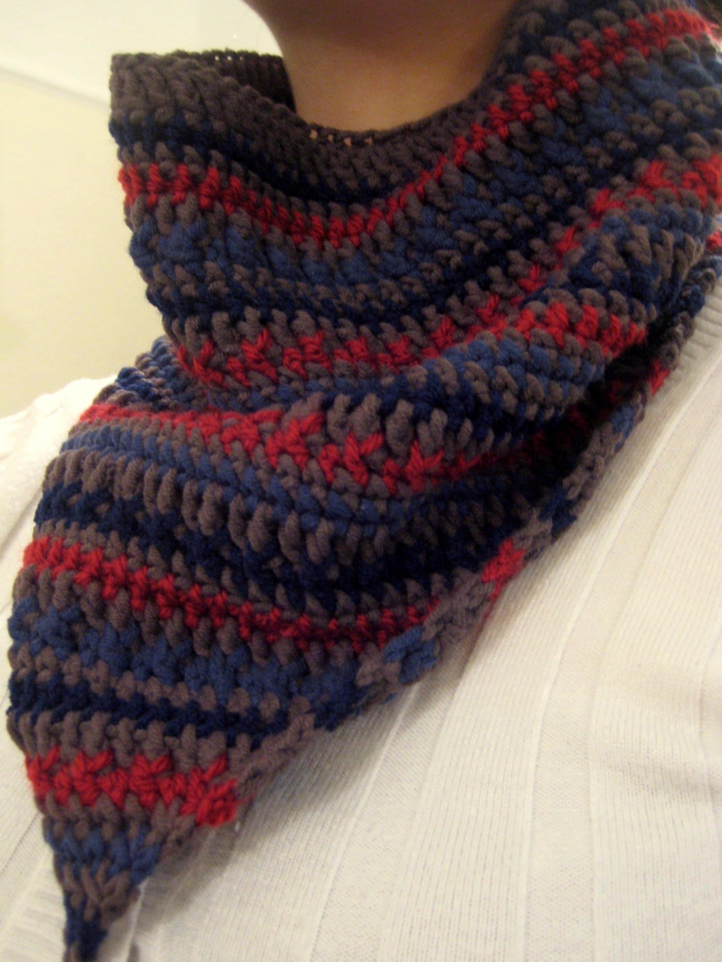 I’ve made a few of these multi-yarn cowls recently so wanted to go for something a bit different. I made this as a Christmas gift for my brother (who writes awesome music, check it out on youtube here). I like the texture of the post stitches and the colour combination.