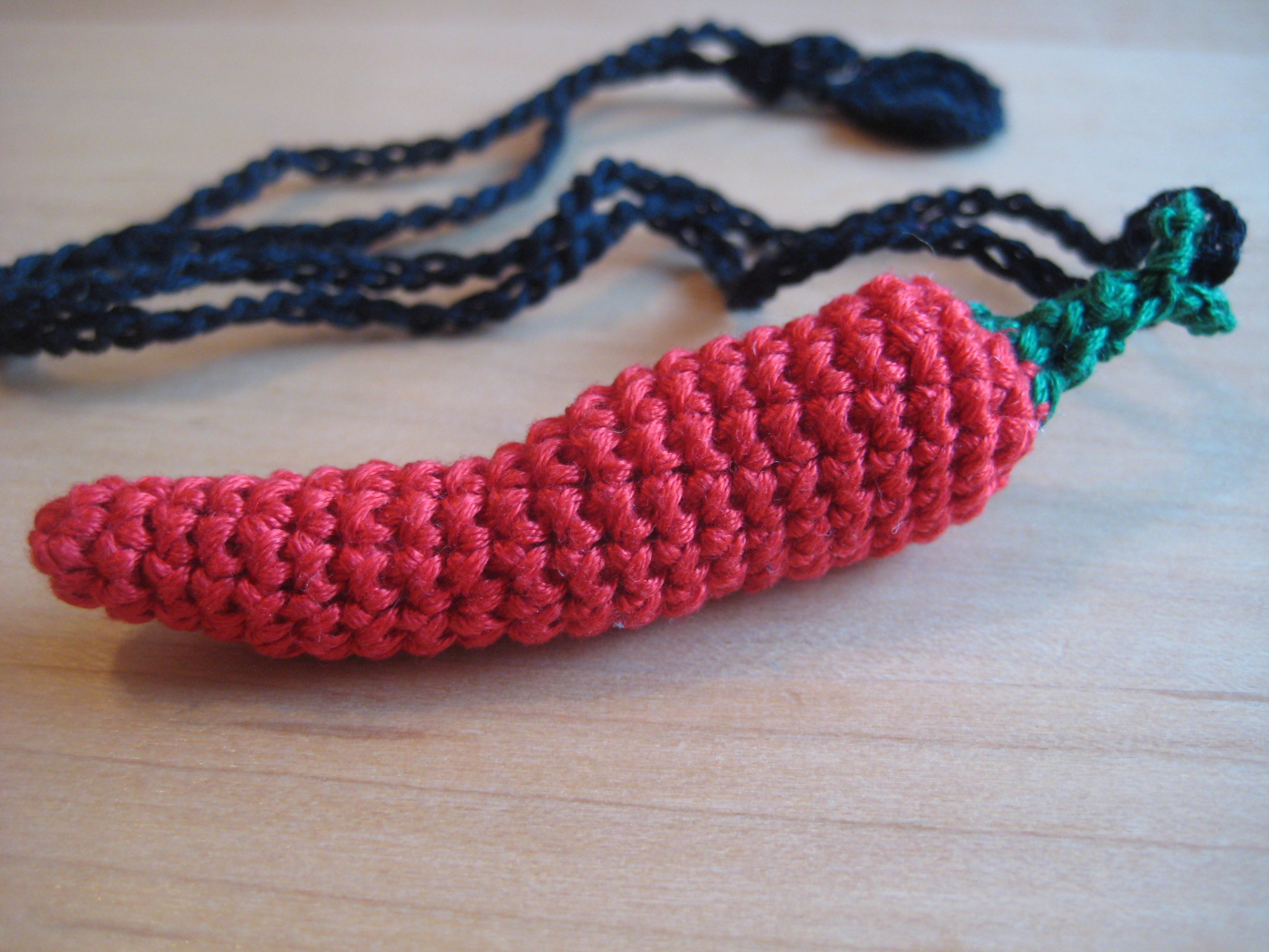 I crocheted this chilli pepper pendant using embroidery thread and made the pattern up as I went along. I’m really pleased with it; I think I will list this one in my shop and crochet another one for me in another red I have lying around! It took a couple of hours because even though it is small I used a tiny hook so it took a while to grow!