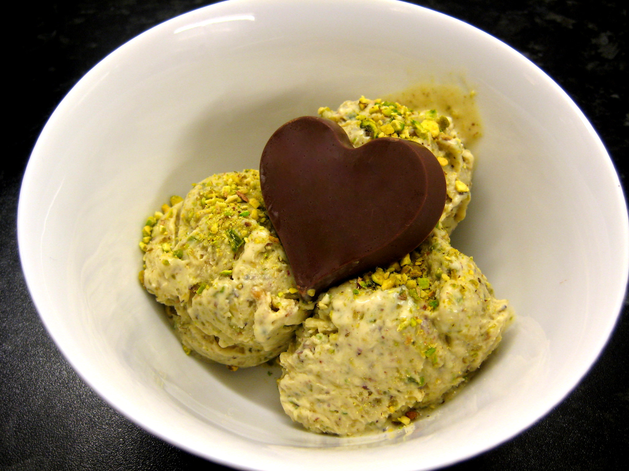 So, this brings me to the ice cream. I’m trying to stick to the recipes, but I can’t always help myself. In this case it stemmed from not being able to get the ingredients from the supermarket, and no time for internet ordering. I substituted finely chopped pistachios for ground and some orange extract for rosewater. It was Valentine’s Day, so I also added some chocolate hearts.