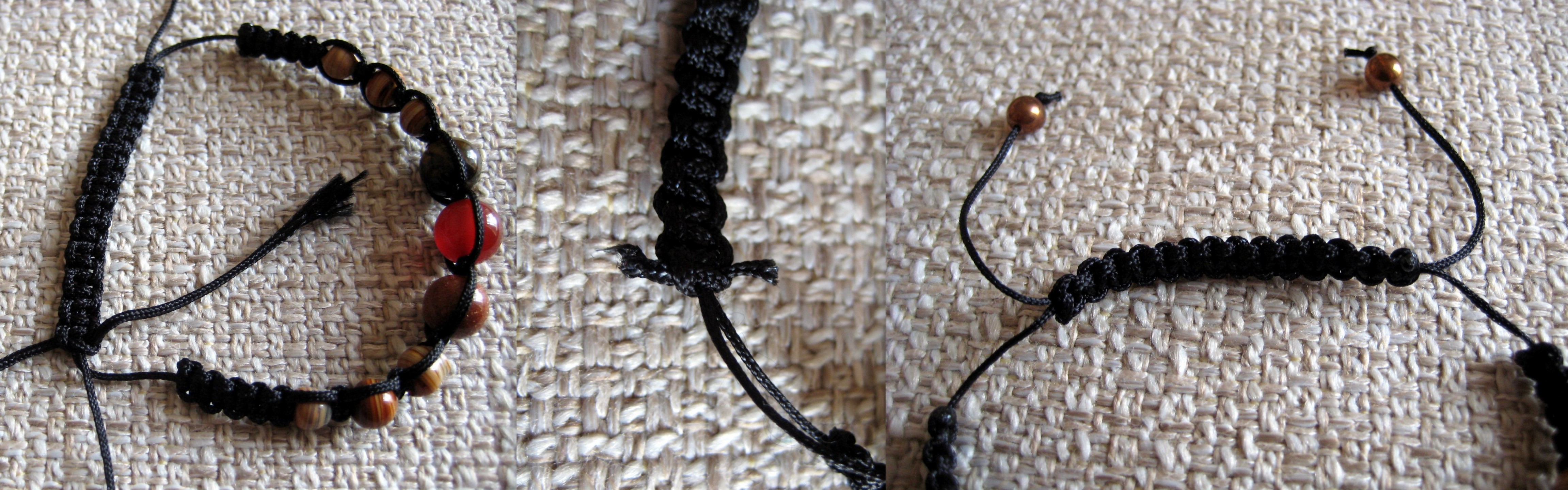 Tie 4 more square knots (or more if you want a larger bracelet) following the same process. Slide a bead up onto the central thread and up to the last knot.