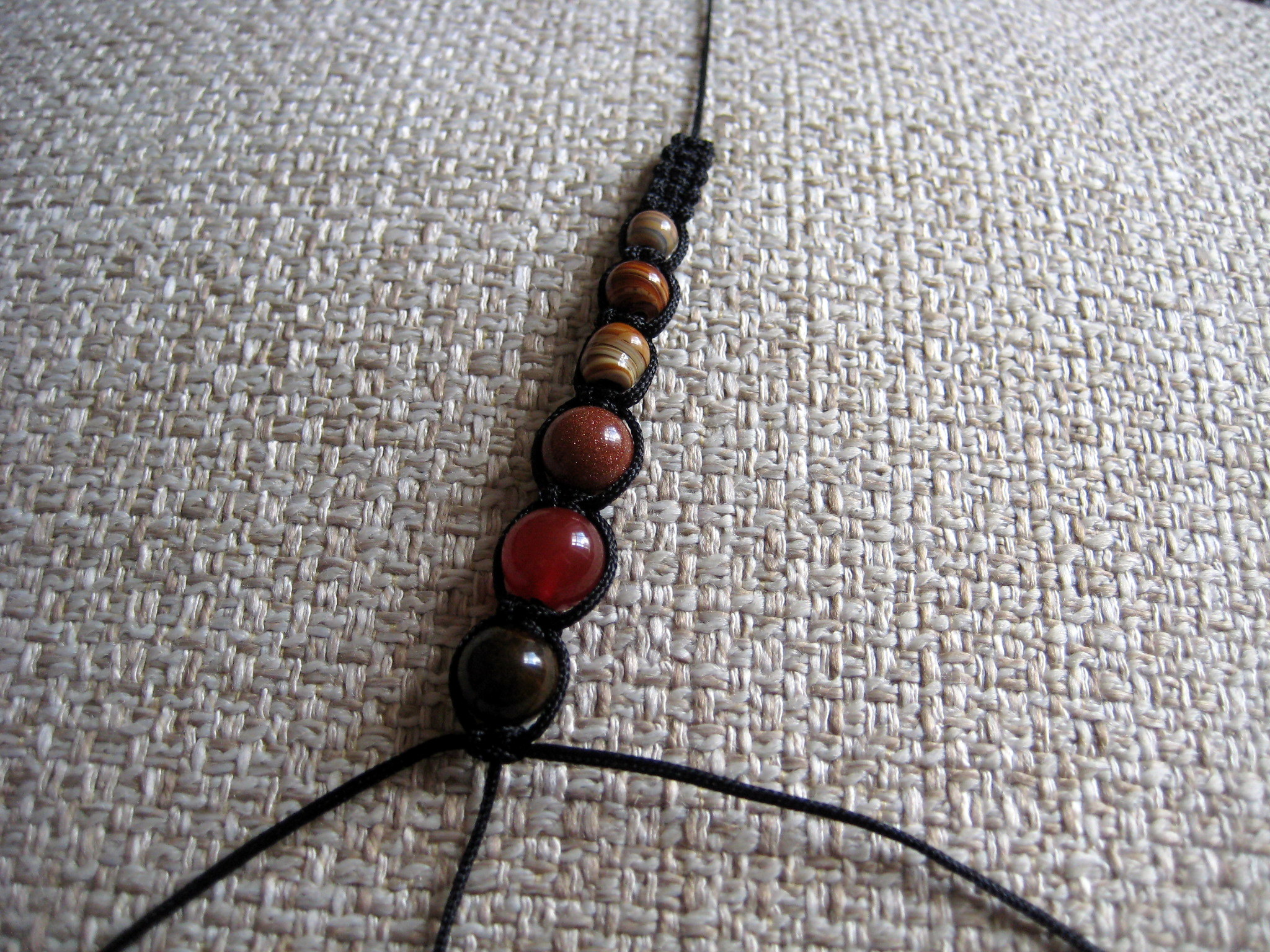 Now tie a square knot to secure the bead in place. Slide on the next bead, tie a knot, and so on until all your beads are secured on the bracelet.