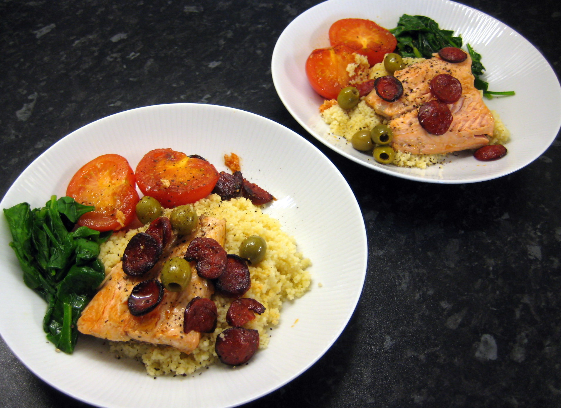 Heat a little oil in a pan and fry the chorizo. Once cooked, remove and add the salmon to the same pan, along with the tomatoes, and cook until done (this depends on the size of your salmon fillets, mine took 2-3mins per side). Meanwhile, steam the spinach, and if you like add a knob of butter. Add the olives to the fish to warm through.