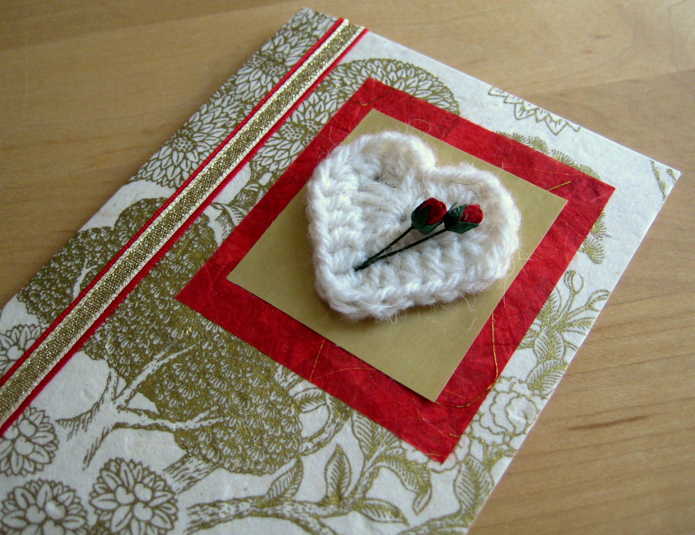 The rosebuds are on wire and were easy to thread through the yarn of the heart to attach them. This was good because if I had had to glue them I’d have had to cover up the glue with something, and I don’t think this wants anything more as the printed paper is already quite “busy”.
