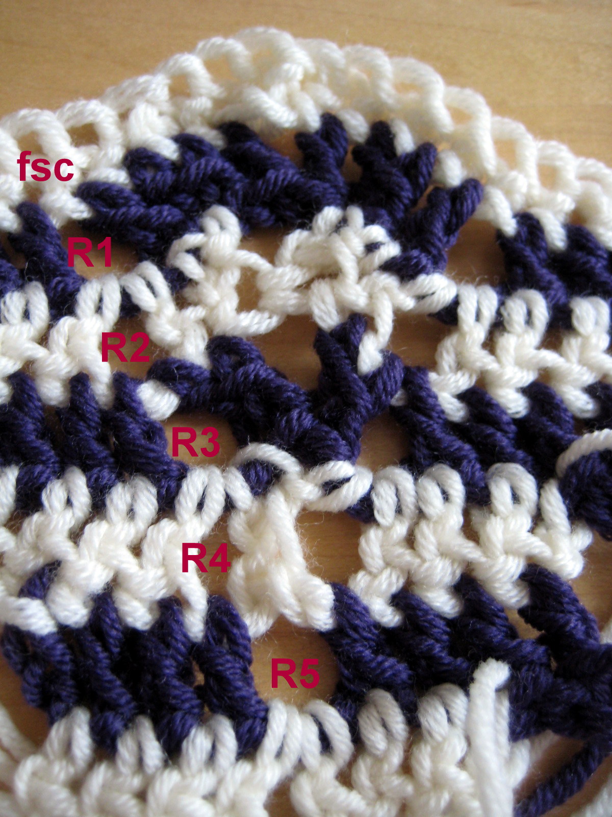 R5: dc in next ch-sp, (continue in original pattern, but repeat this R5 at next marker)