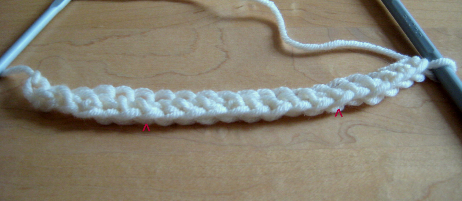Remaining body rounds: The 10 fsc marked are what need to be eliminated. Follow the original pattern as before, but when you reach a marker perform a decrease row (always after a ch2 in pattern) as described, moving the st marker down each time: