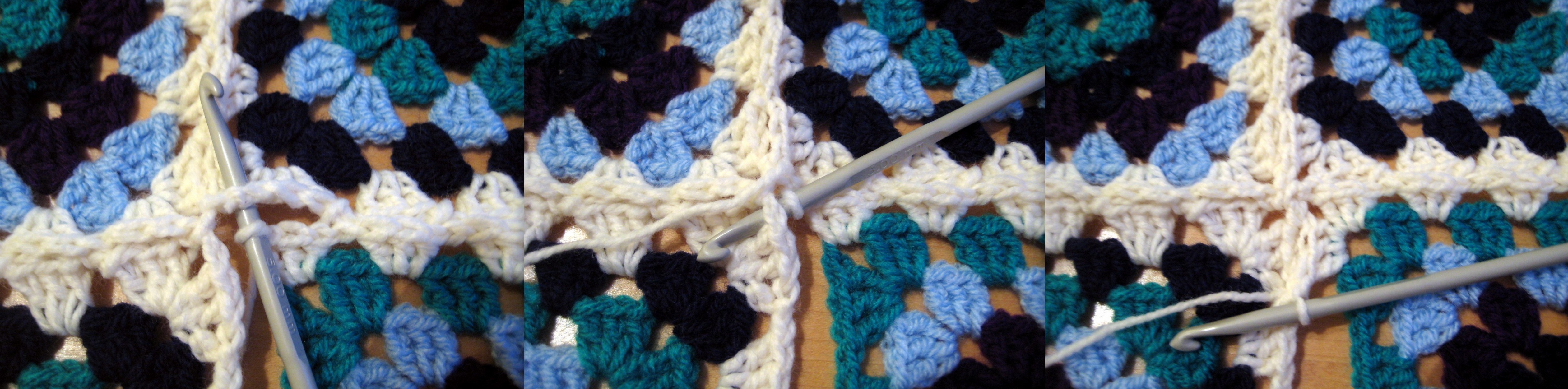 Do 3 more dc into the corner ch sp of the original square. Now instead of a ch 1, sl-st into the ch space of the square you are joining to, and repeat along the side.