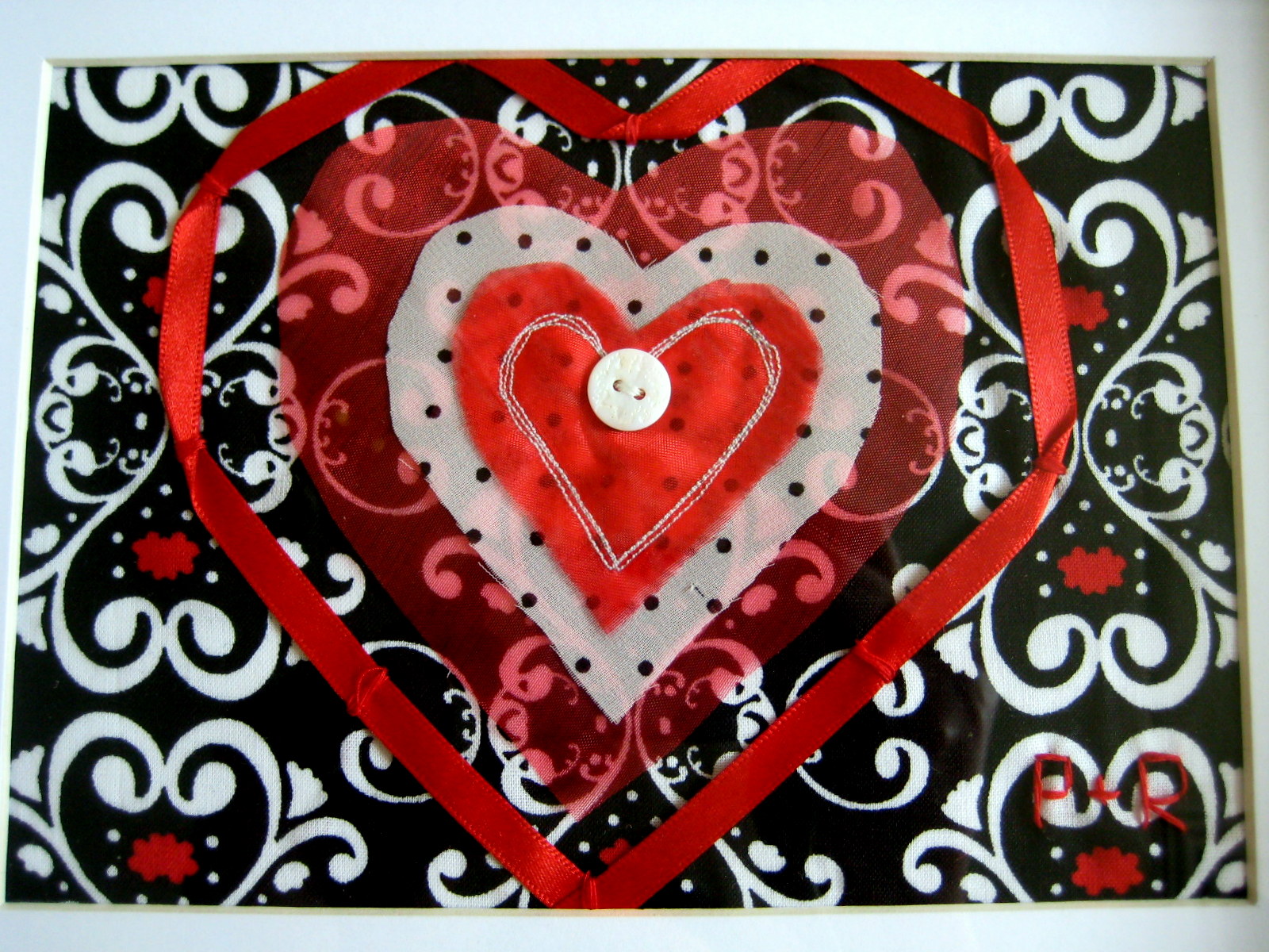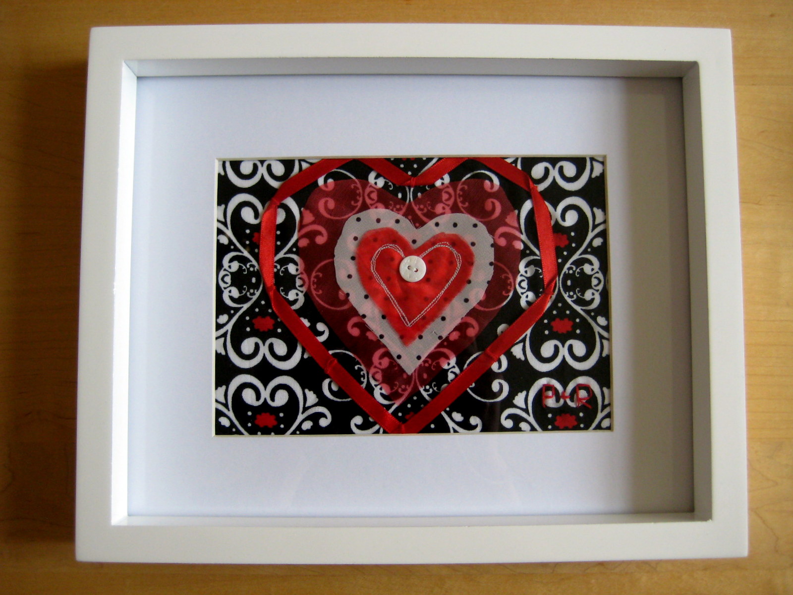 Checking the hearts will fit in the frame, make yourself 3 heart templates out of some scrap paper, pin to your fabric and cut out. I used one large red heart, one medium polka dot heart, and two small red hearts (overlapped to intensify the colour) in my picture.