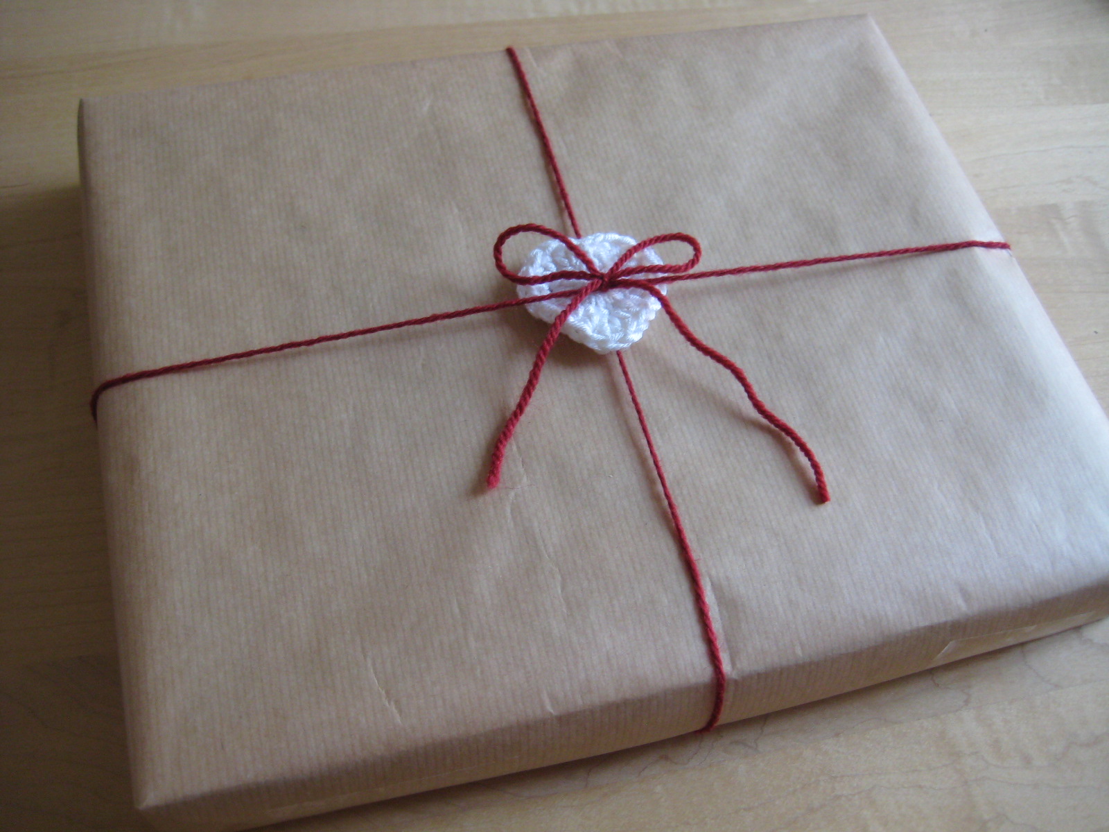 I used co-ordinating yarn to wrap this gift, and made one of my crochet hearts. I love brown paper wrapping!