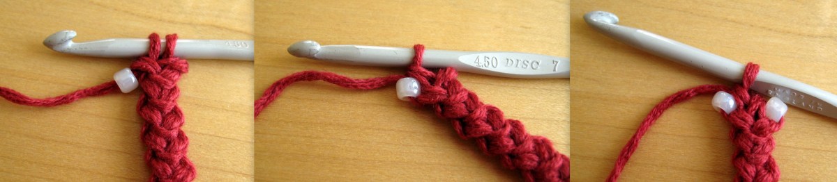 L-R: Insert hook and slide up bead; Complete sc; Repeat (two beads inserted)