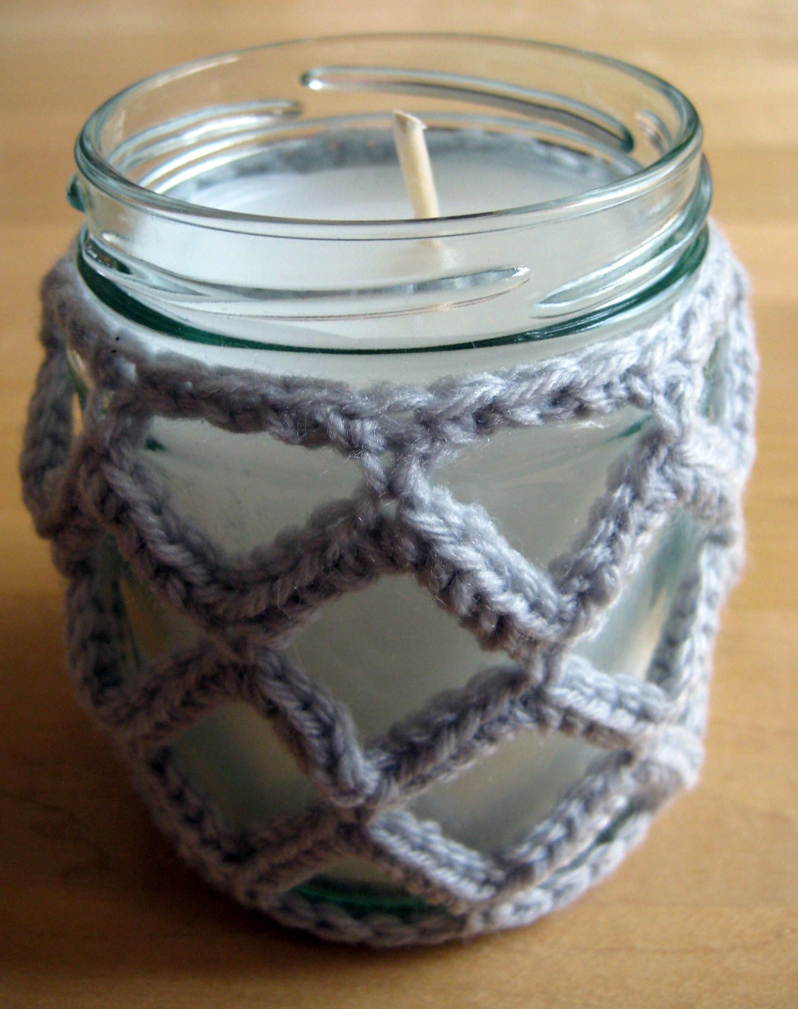 Make your crochet cover shorter than the lip of your jar, you do not want your yarn catching on fire!