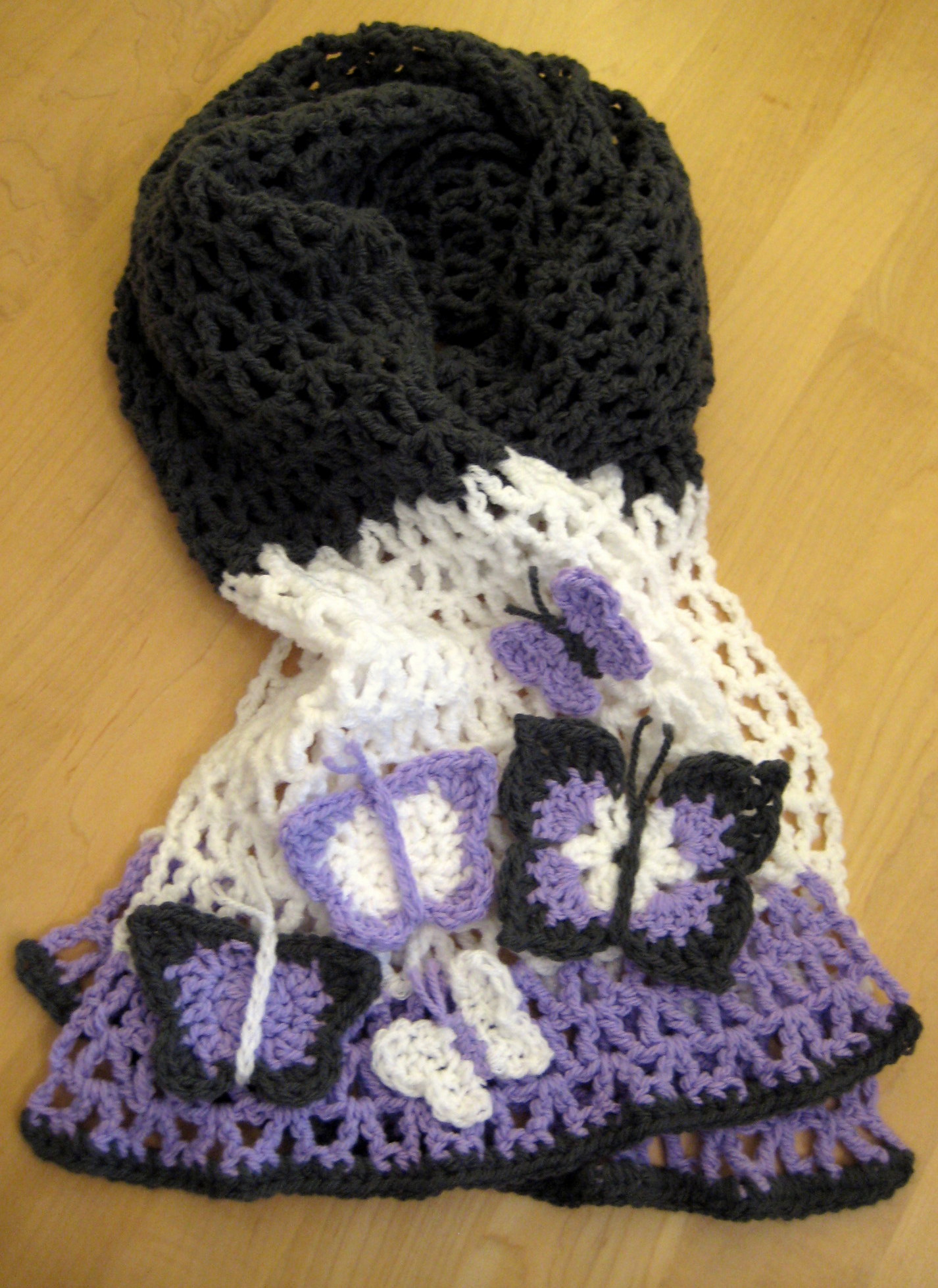 Fortunately I had a few projects lined up to share with you. This cute butterfly scarf, for example. It is meant to have a matching hat, but since that is only half finished it will have to wait until I’m all healed up!
