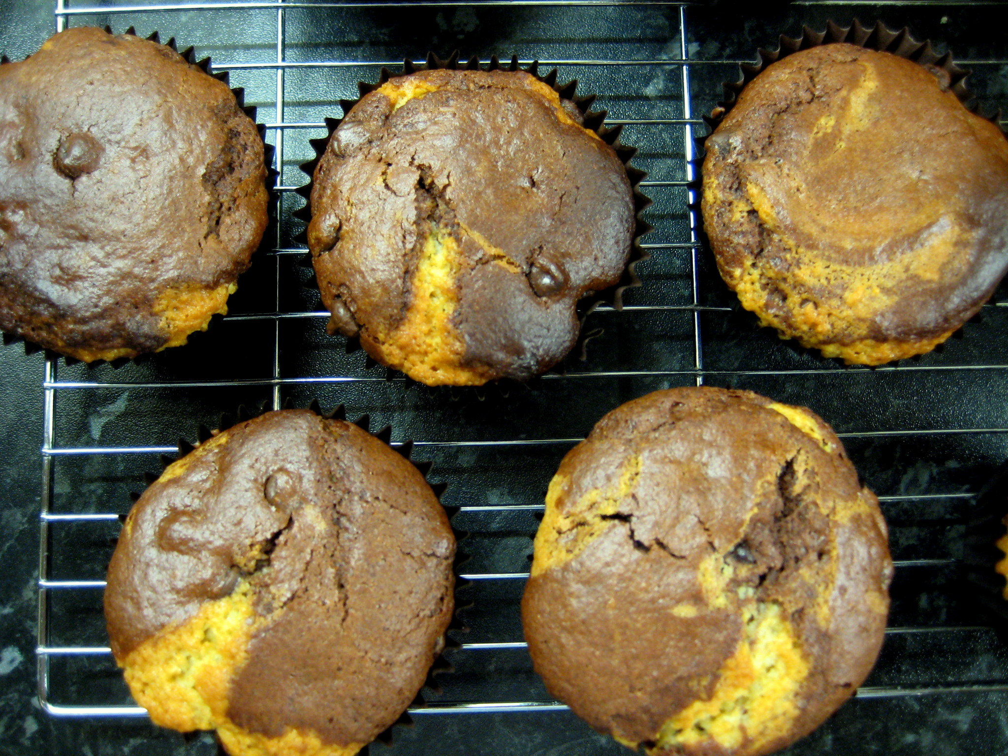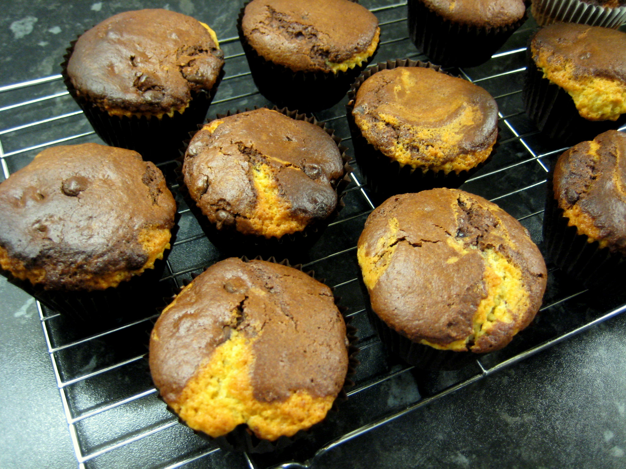 They were meant to be marbled, but when I tried to swirl them it didn’t really work (I think a combination of the batter being too thick and the fact that I put them in paper cases). So in the end they had to be half and half muffins instead!