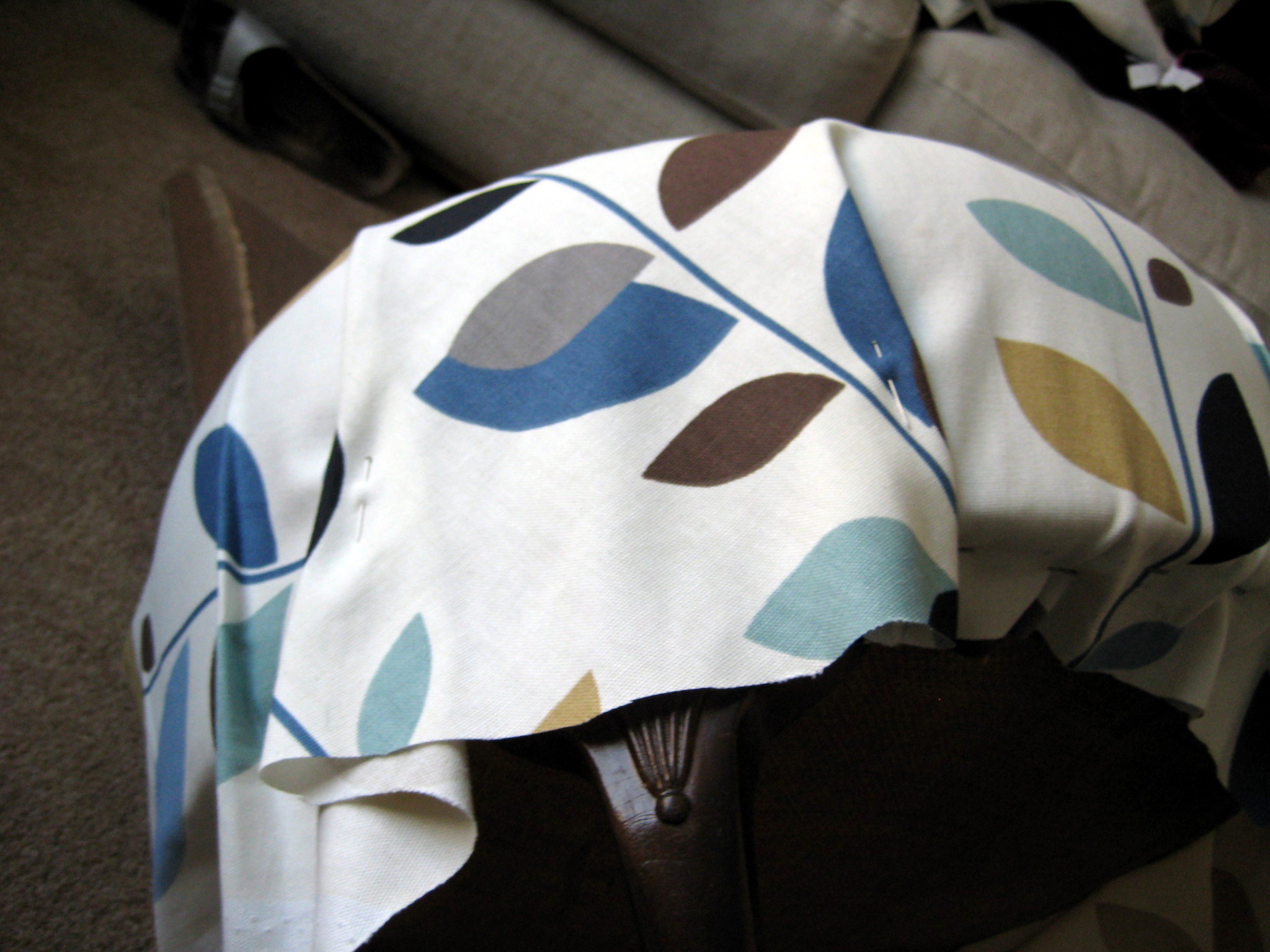 I started by trimming away the “hairy” edges so that they wouldn’t show through. There was actually rather a lot of it! Then I cut my fabric larger than the seat and lay it over, centring the design on the chair. (A little later I discovered that the stems on this print are not actually equidistant from each other, which was a little frustrating!)