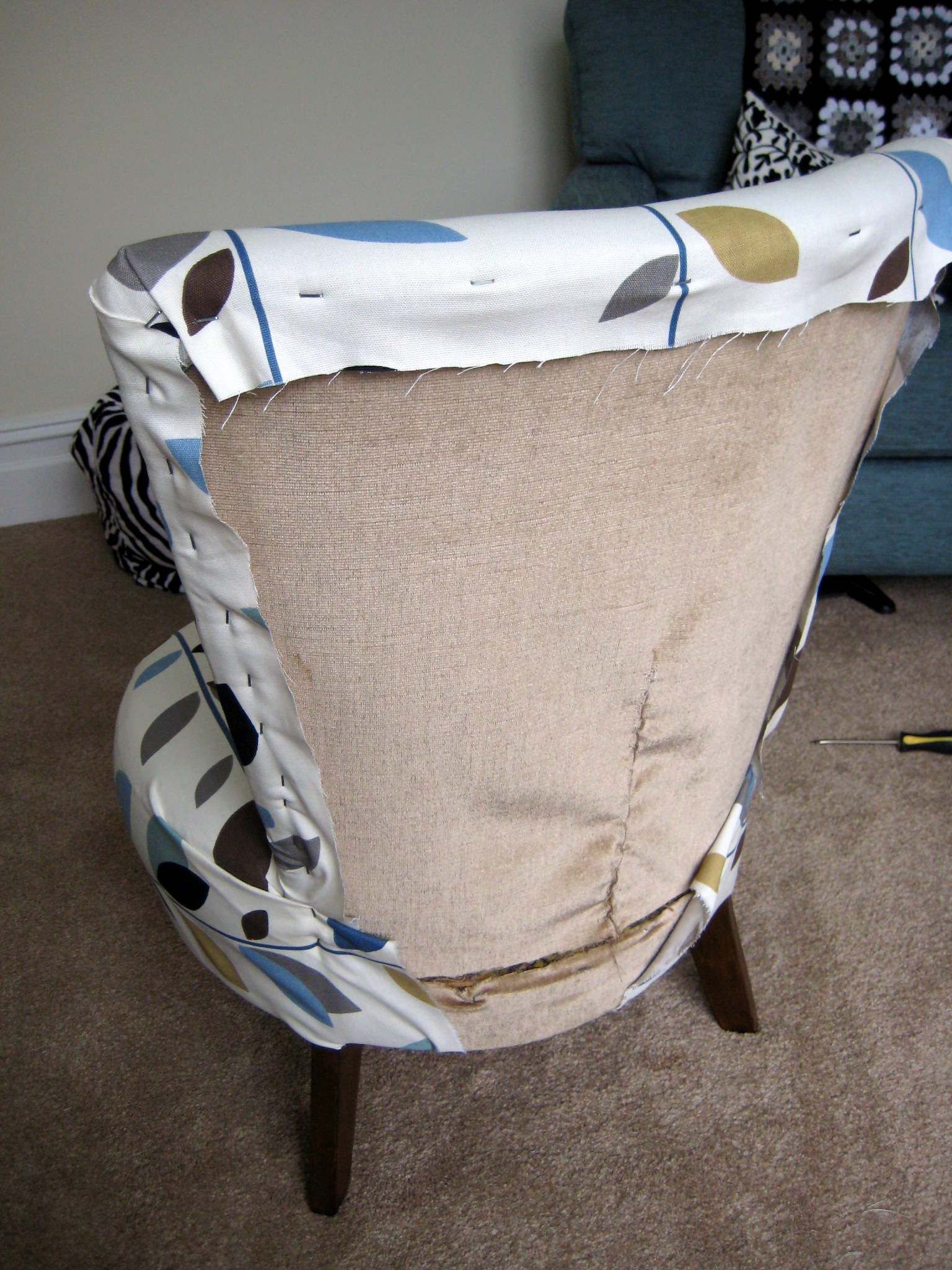 Having said that, my husband hated this chair! It’s funny because to me it is kind of neutral (in fact it is almost the exact same colour as our carpet). Apparently it is because of the “hairy” trim. And the fabric is worn in a lot of places, so the solution was to re-cover it. Having never tried upholstery before I started by watching this video on re-upholstery: YouTube