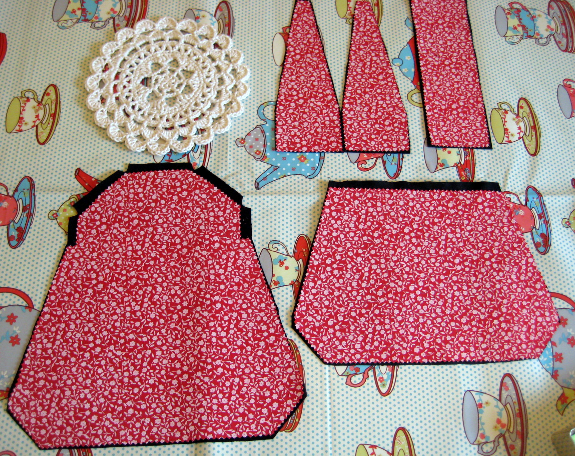 First download the pattern pieces (scroll down for the pdf pattern) and make sure they are to scale (or scale them to suit your doily size). Cut them out including the 1 cm seam allowance. You may need more if you are working in a fabric which frays – leather is nice to work with in that it doesn’t fray, and I was constricted by the pieces I had salvaged from my jacket so I cut the seams allowance pretty close!