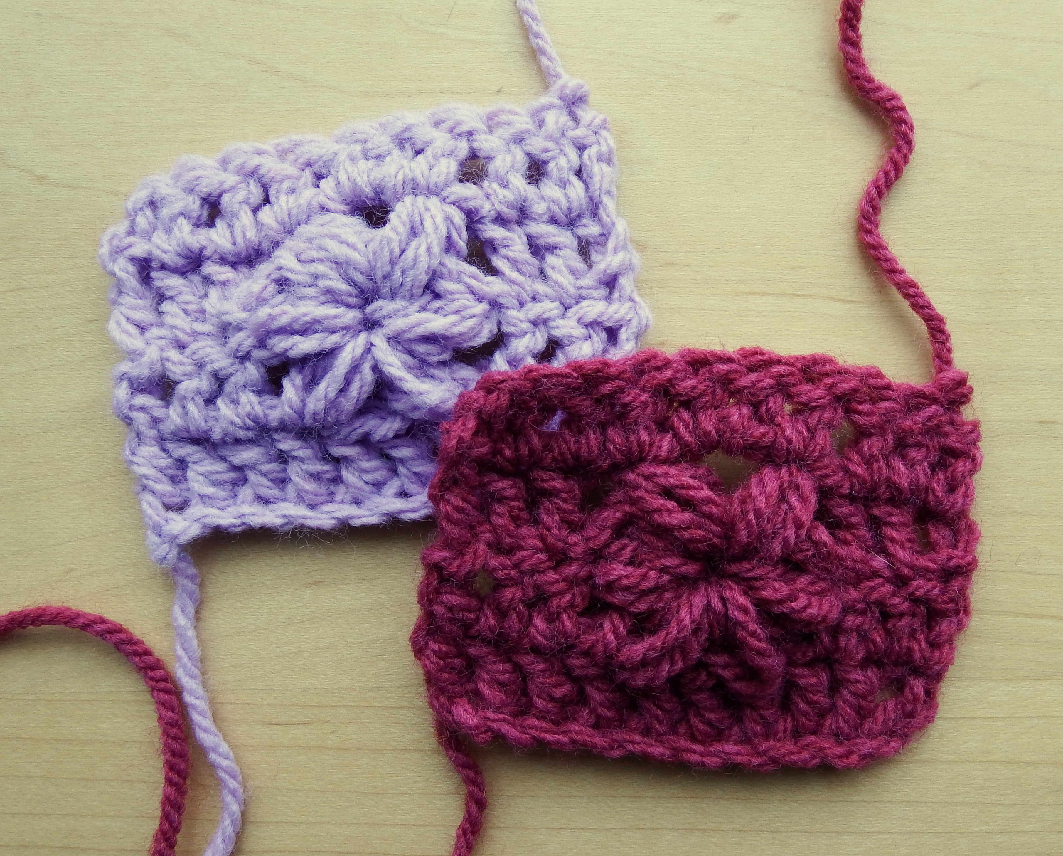 This time it’s the turn of the puff stitch flower. This stitch is easy to do once you have mastered drawing up the loops to the right height – you’ll only need to try this a few times to get it! And once you know this stitch you can use it to pretty up any plain double crochet piece you are working on.