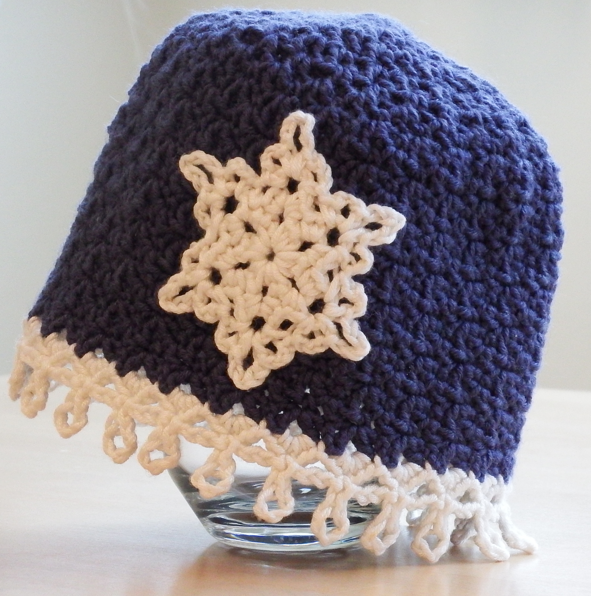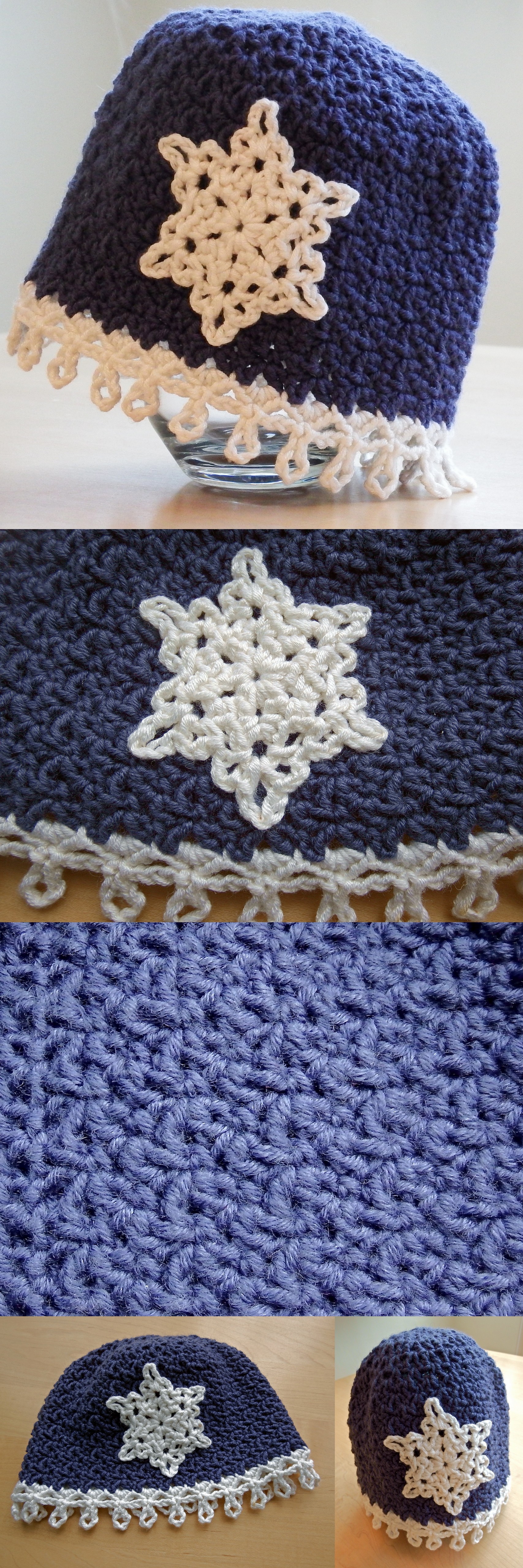 The hat is worked in the round from the centre top down. The snowflake is a separate applique sewn on at the end.
