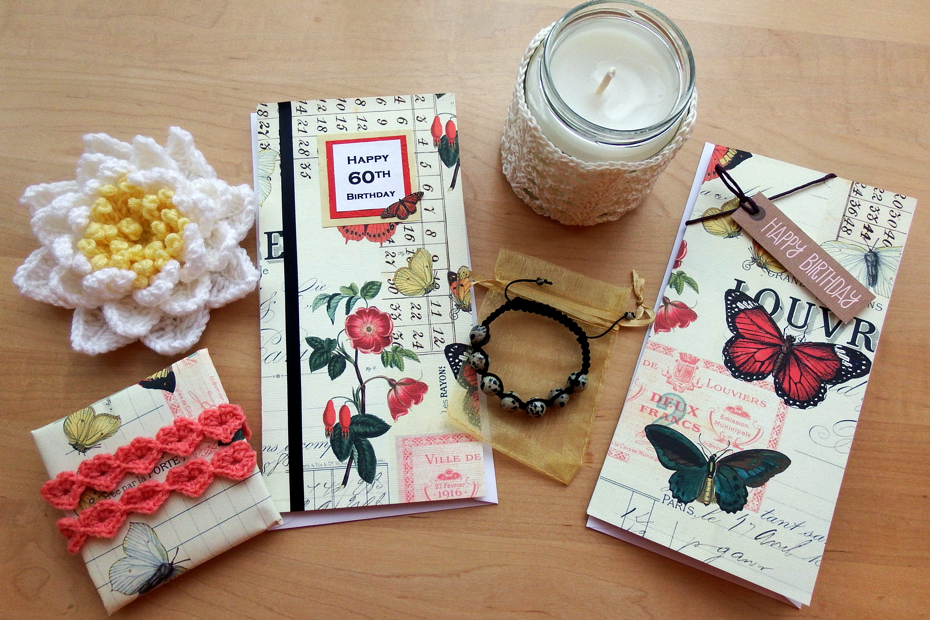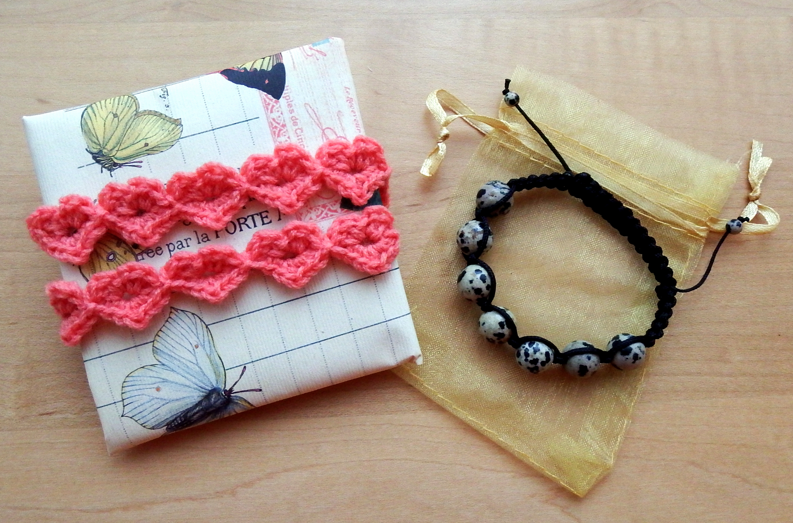 Butterfly cards, heart strings gift wrapping, Shamballa bracelets, Crochet Water Lily and Crochet Shells and Lace Jar Cover