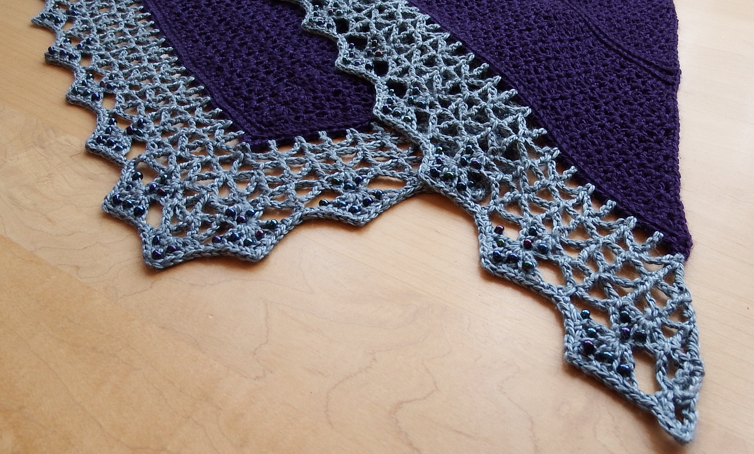 I’ve named this shawl “Atlantic” because I crocheted the majority of it whilst on the plane over this ocean during my recent trip to North America. I think it’s an apt name since the deep inky purple colour of this yarn is not unlike the ocean itself at night. I chose a grey border to represent cresting waves and added sprays of petrol blue-purple beads to keep with the theme.
