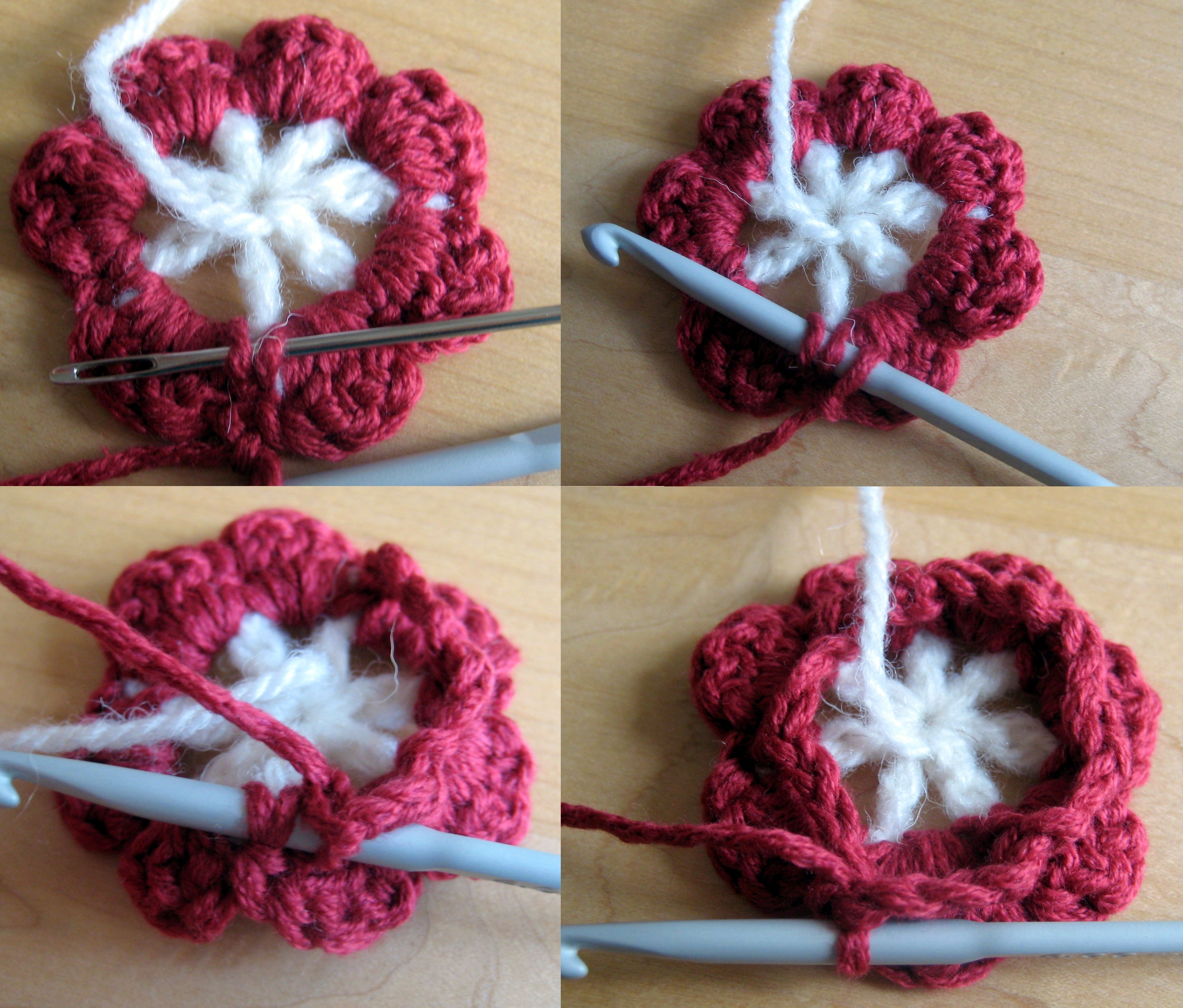 The pattern is worked in the round from the centre out. The pattern is based on my triple layer petals flower pattern (which has 7 petals around whereas this has 6 petals around).