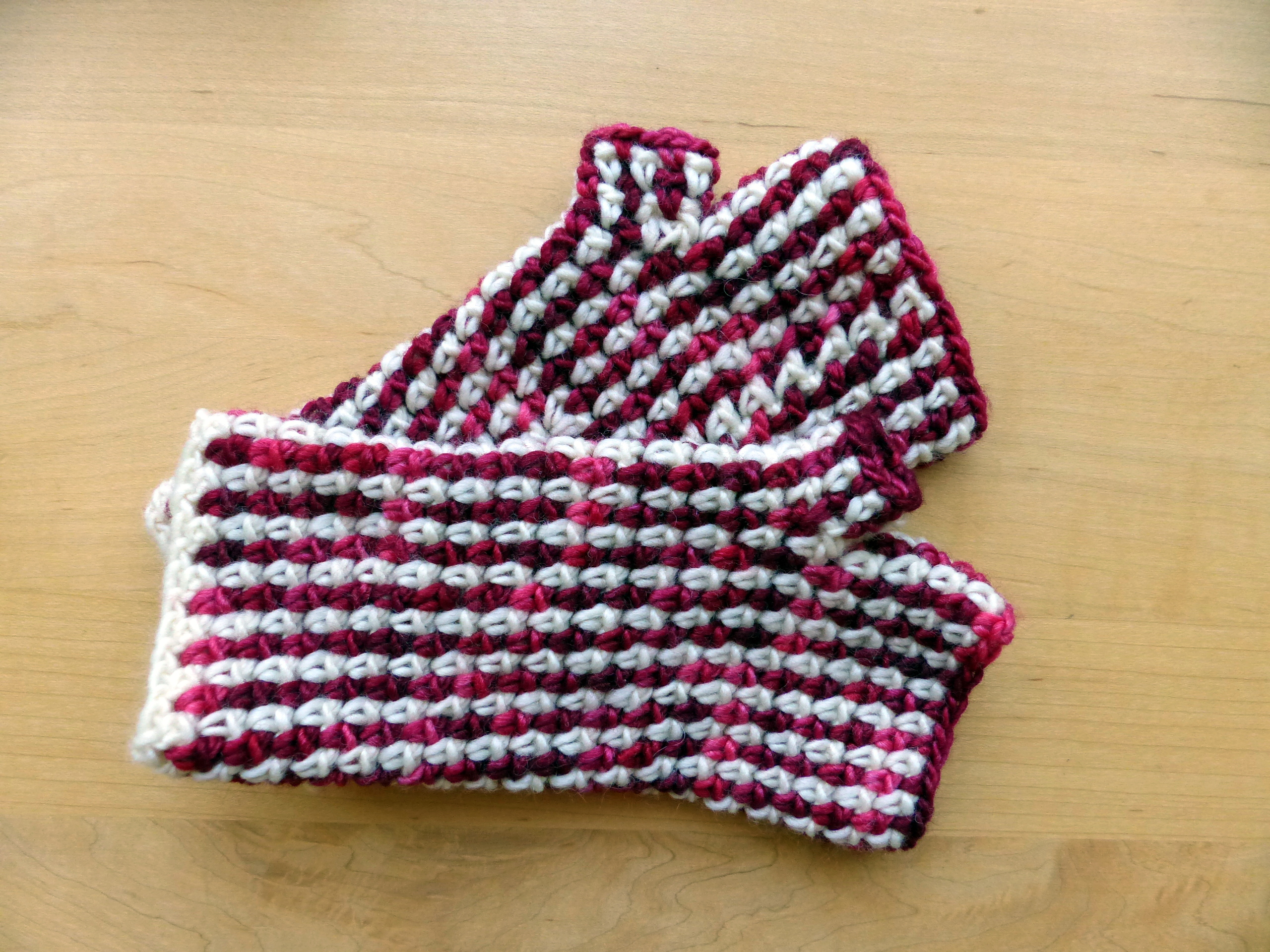 These fingerless gloves are made in the round starting with the arm and increasing over the hand before splitting for the thumb and finger holes.