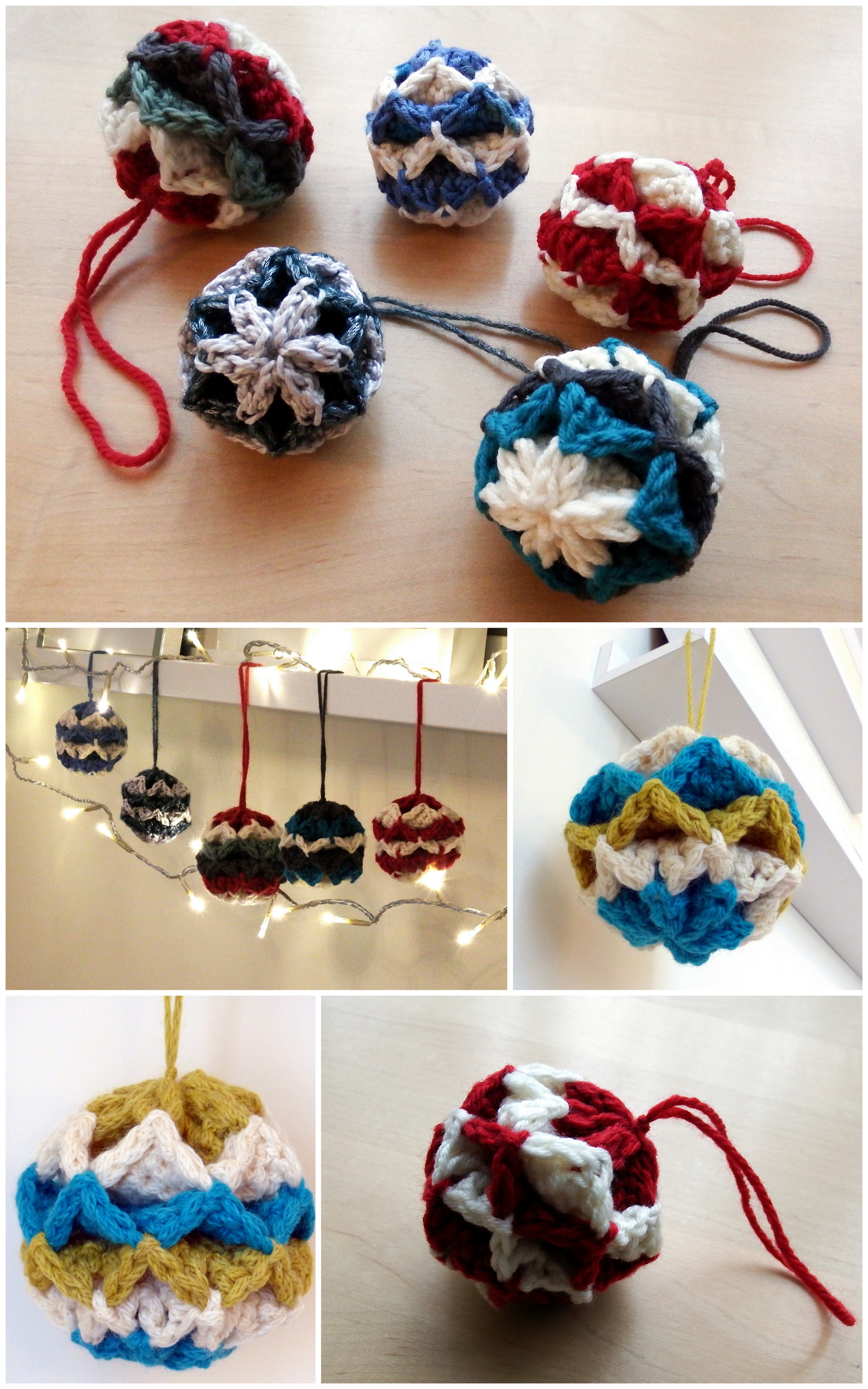 I’ve been busy making more of these origami baubles this week. I’m sure plenty of you have your decorations up already but for me it’s still a week early, which gives more time to crochet some of these! I tried making a giant bauble out of the chunky yarn left over from my Plaid Cowl using a 10mm hook. I was worried the yarn would be too soft but it turned out great (though it is hard to resist squishing it every time I see it). I’m also pleased because the colours actually go really well in my living room. So don’t waste those scraps, turn them into baubles no matter what the yarn size and fibre type!