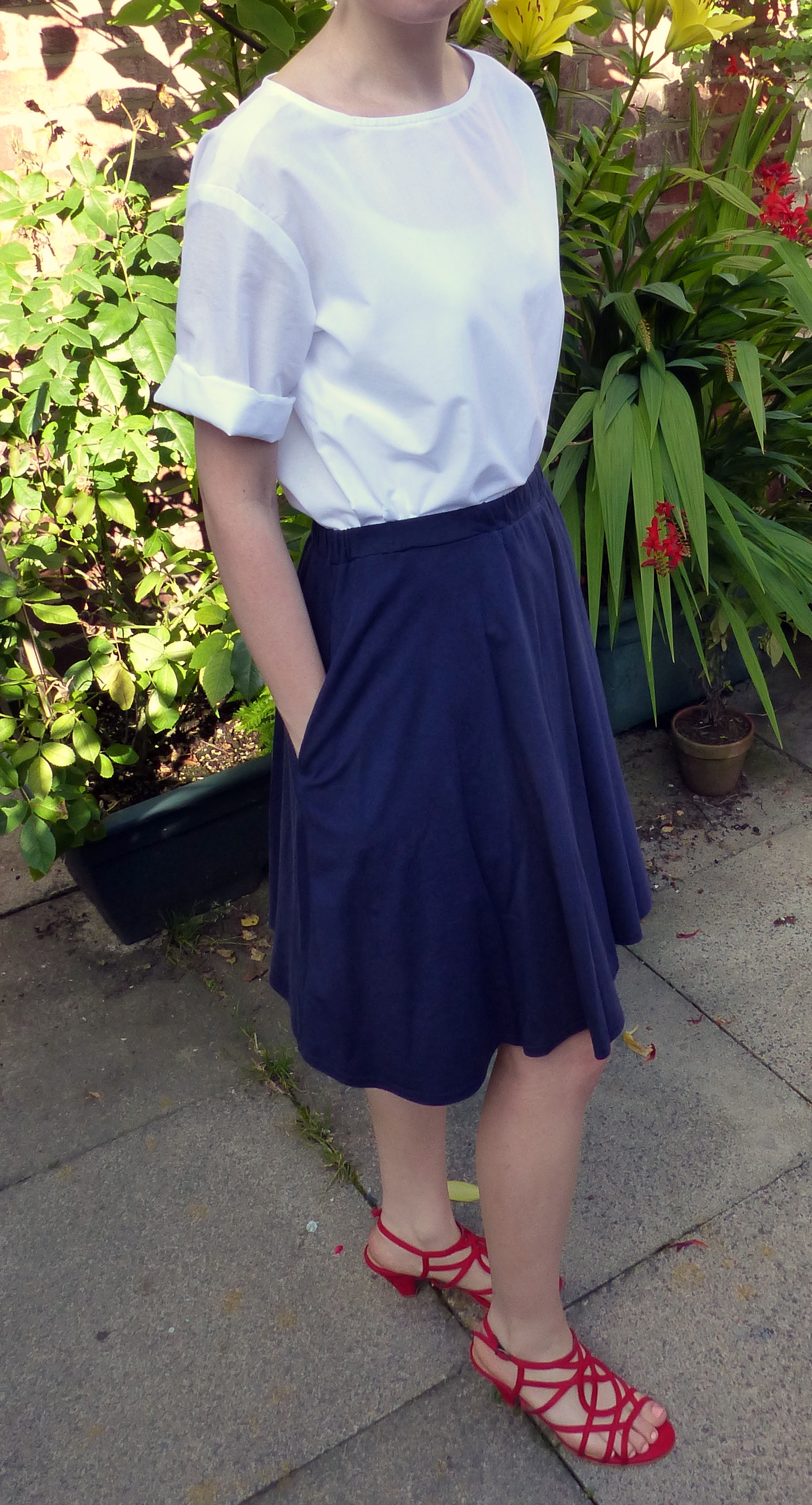 I made my own pattern by drawing around a jersey skirt I already had which I love wearing. It’s just two pieces – a front and back, which are both the same (yay for forgiving stretch fabric). I did think about adding side pockets but was worried they would make bulges which would show so I didn’t bother in the end. The waistband is just folded over with elastic encased. I probably should have made a separate waistband but this seems to be working just fine!